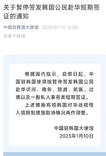 中国驻韩使领馆暂停签发韩国公民赴华短期签证